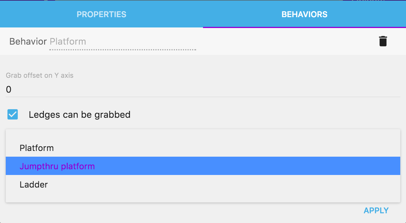 Hasta ahora, el objeto no es considerado una plataforma. Edita el objeto y cambia a la pestaña Comportamientos. Añade el comportamiento denominado Plataform y finalmente elige "Jumpthru platform" en la lista cuando hagas click en el campo "Type":