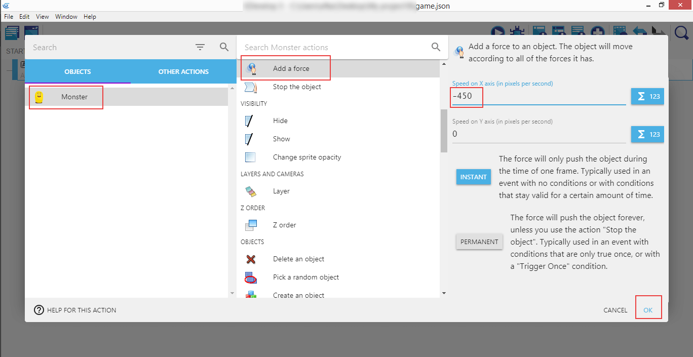 Make sure the "Instant" option is selected, as we want the Monster to move only when the left key is pressed, and stop when it is released.
