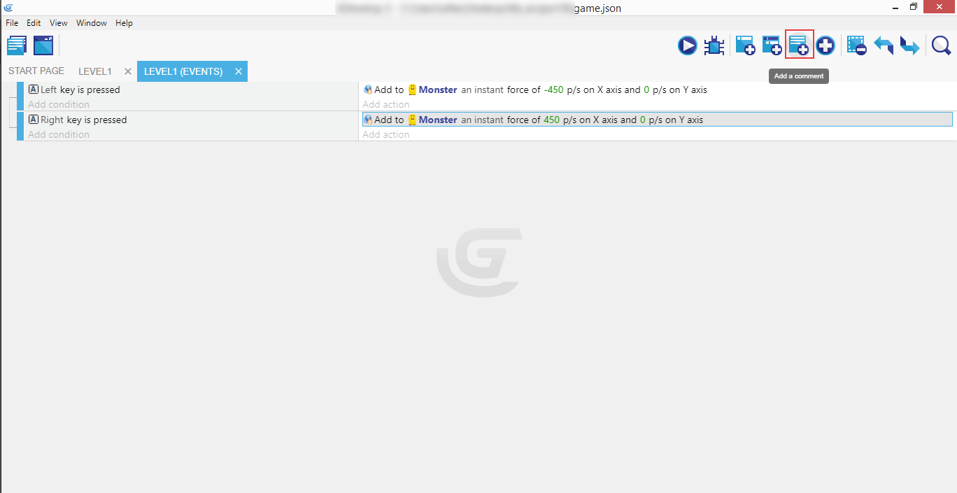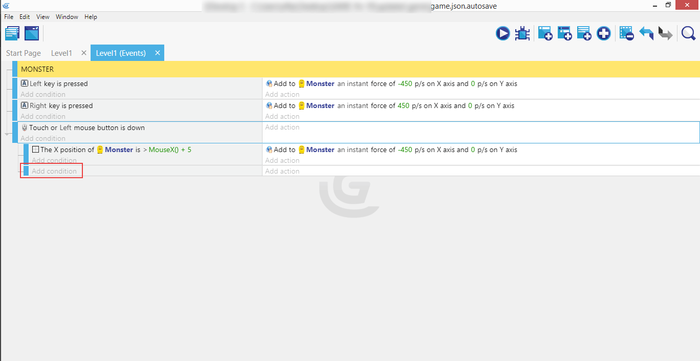 If you completed the right movement, both events with their conditions and actions should now be in place, so the Monster can move in either direction - left or right.