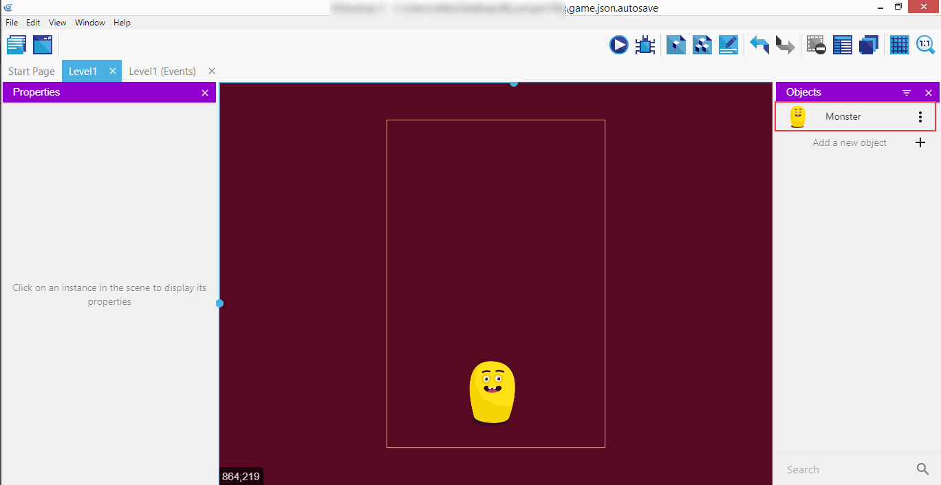 Drag the Monster from the right panel containing the objects onto the scene and click on the "Level1 (Events)" tab.