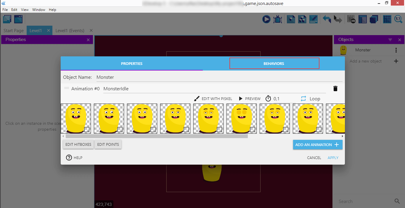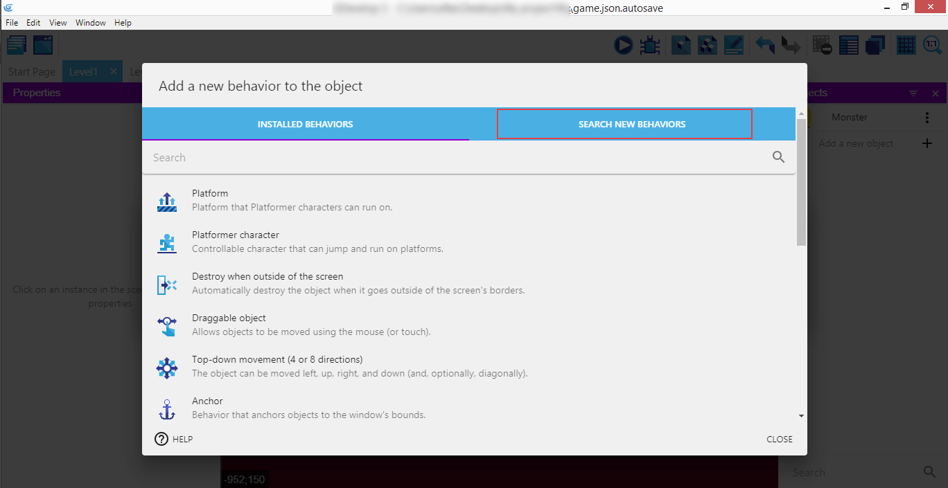 It's the "Stay On Screen" custom behaviors that we're going to use for the Monster.