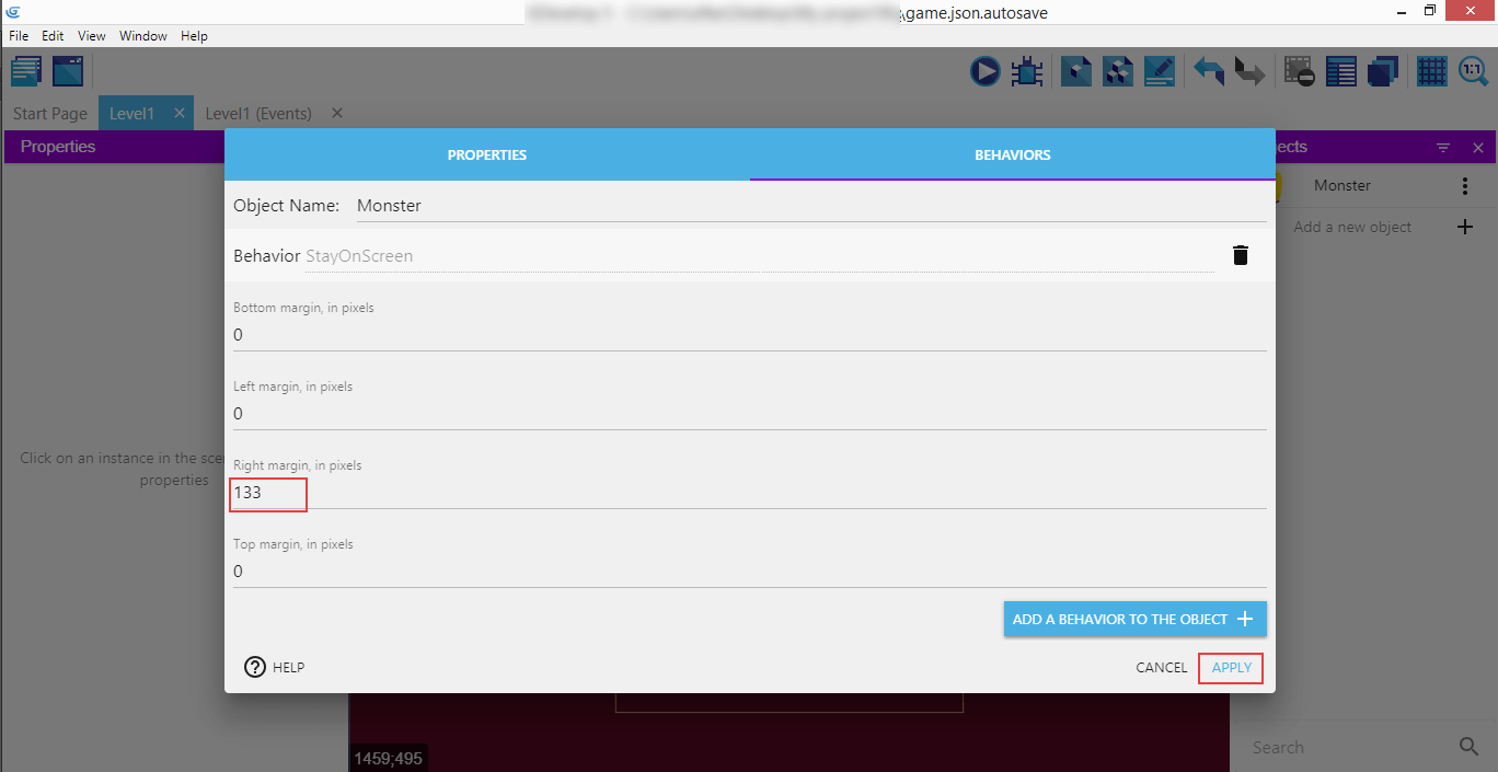 Insert 133 as the right margin, since this is the width of the Monster, to limit him going out of the screen to the right (since his origin is in the top left part of the sprite), and then click Apply.