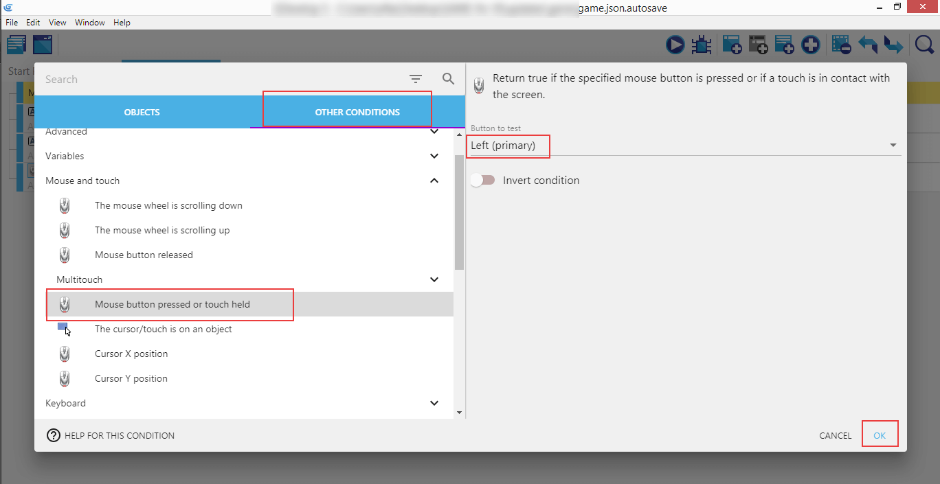Don't have the "Other conditions" tab? Don't panic! Go to GDevelop preferences (click on the "File" menu, or "GDevelop 5" on macOS, then "Preferences"). Activate "Use the new action/condition editor". You can then go back to the tutorial.
