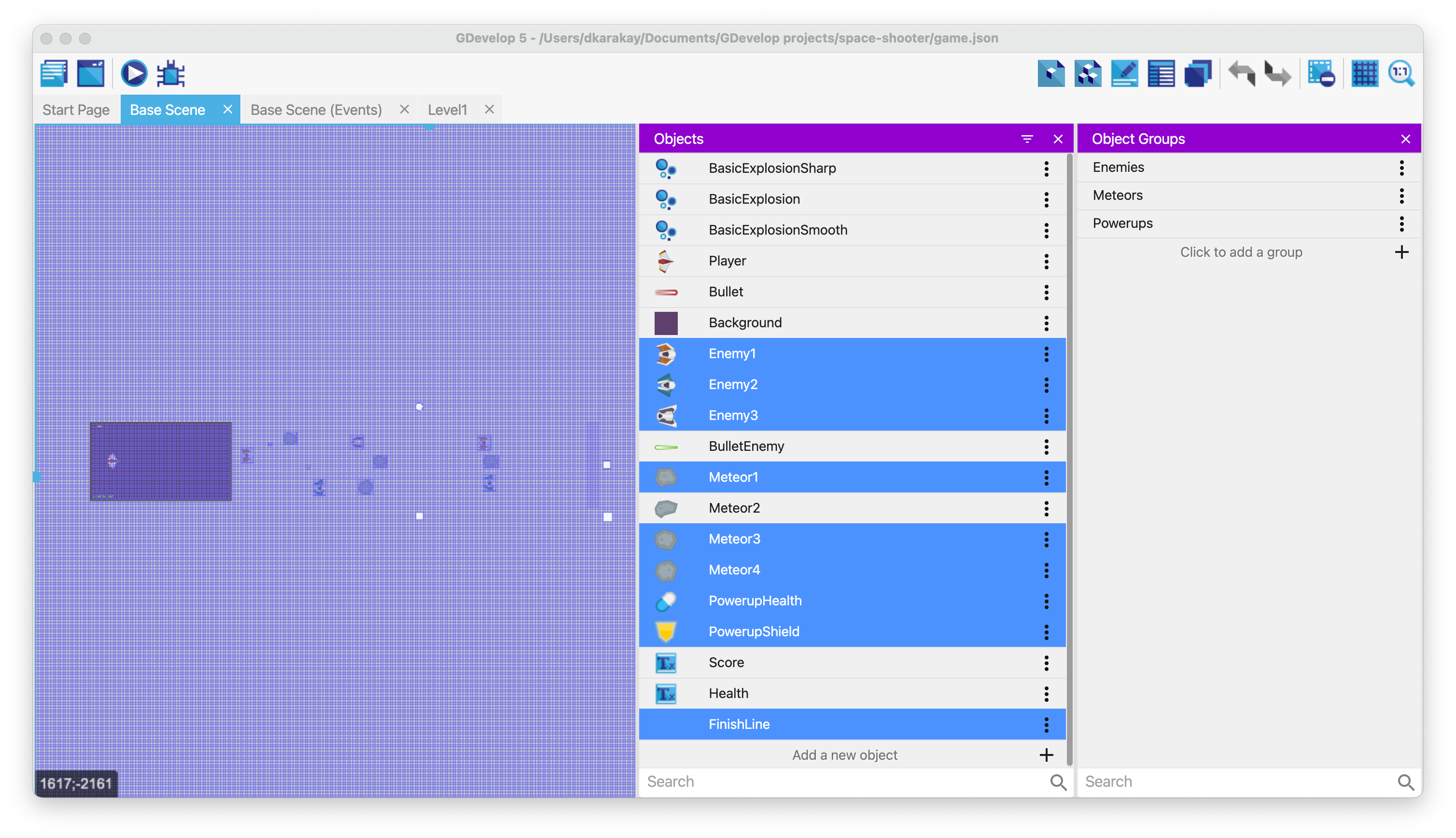 Now, we should go back to the Base Scene and delete all enemies, powerups, meteors, and the finish line. We will add those objects and set up our levels in the external layouts.