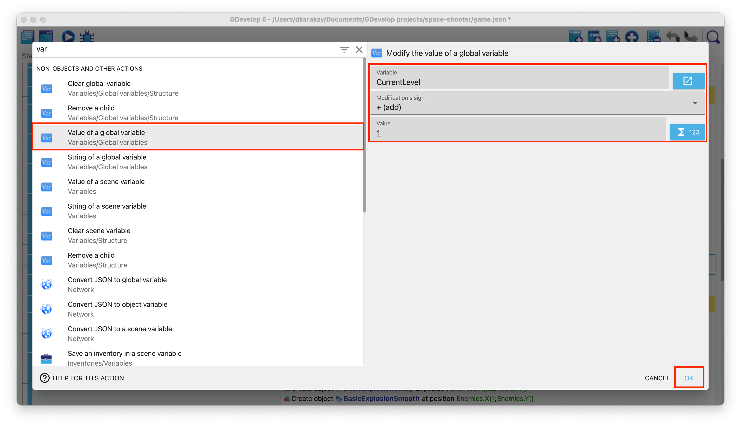Open the Events tab, and add a new condition to determine the collision between Player and FinishLine. Then, create a new global variable called CurrentLevel and set to 1.