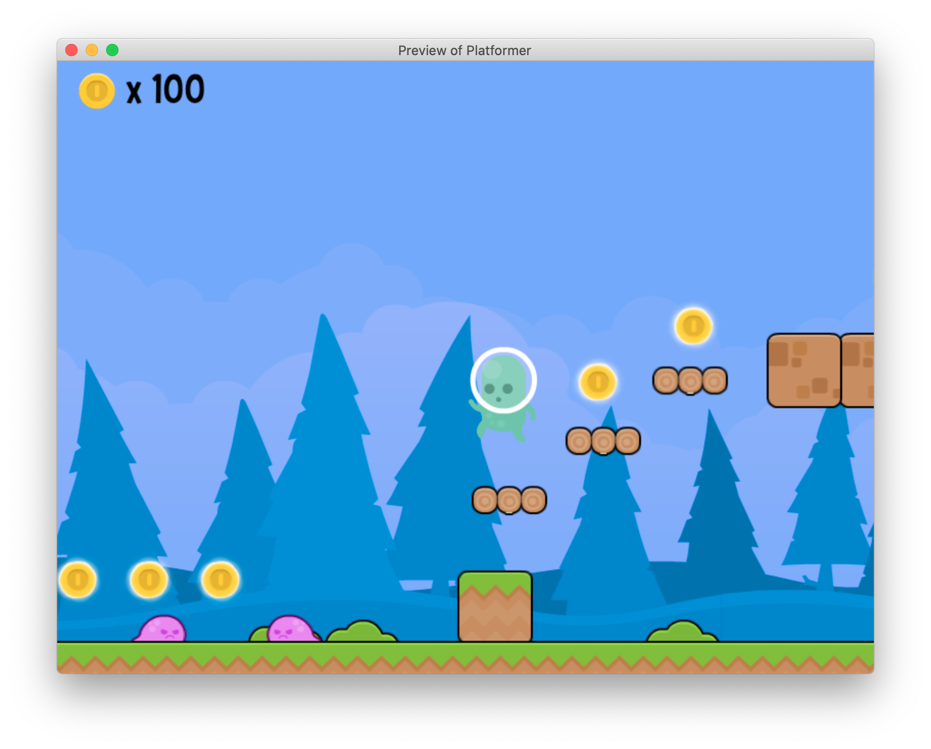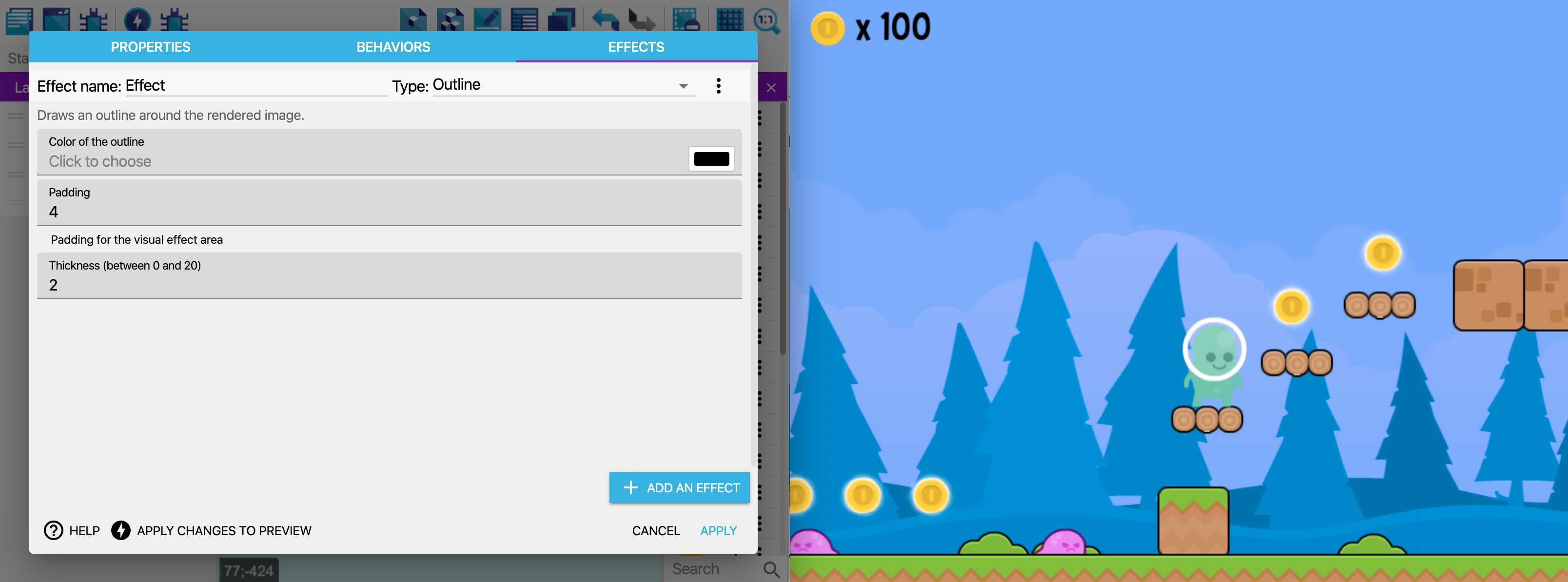 このスクリーンショットでは、複数のオブジェクトに「Outline(アウトライン)」エフェクト(漫画やアニメのような効果)をかけ、コインには「Glow(グロー)」エフェクトをかけています。